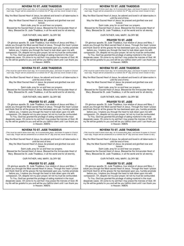 NOVENA TO SAINT JUDE THADDEUS NOVENA TO SAINT JUDE THADDEUS NOVENA TO SAINT JUDE THADDEUS NOVENA TO SAINT JUDE THADDEUS Must be said 6 times each day for nine Must be said 6 times each day for nine Must be said 6 times each day for nine Must be said 6 times each day for nine consecutive days leaving 9 copies on church consecutive days. Ad Enjoy low prices on earths biggest selection of books electronics home apparel more. Jude novena prayer book by Claretian Missionaries.